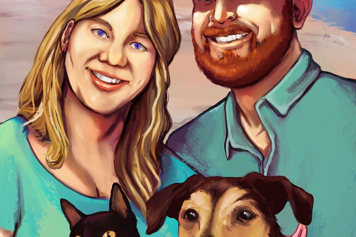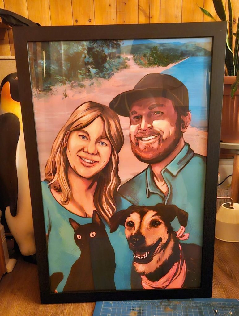 An extra personal touch was the inclusion of a beloved but departed cat, Toby, into the illustration. It’s always special to honor a family friend in this way.