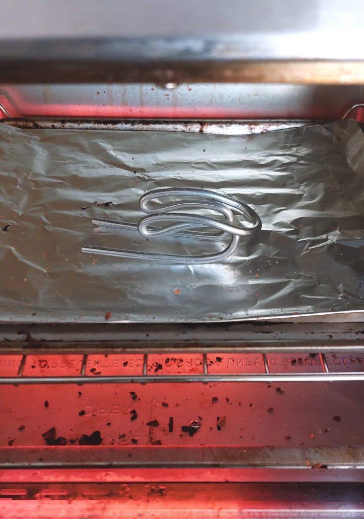 Once I was happy with the folds and initial fittings, the clip was popped into a toaster oven for about 30 minutes to soften the metal somewhat. From there, it was a bit easier to manipulate the wire into the needed shape.