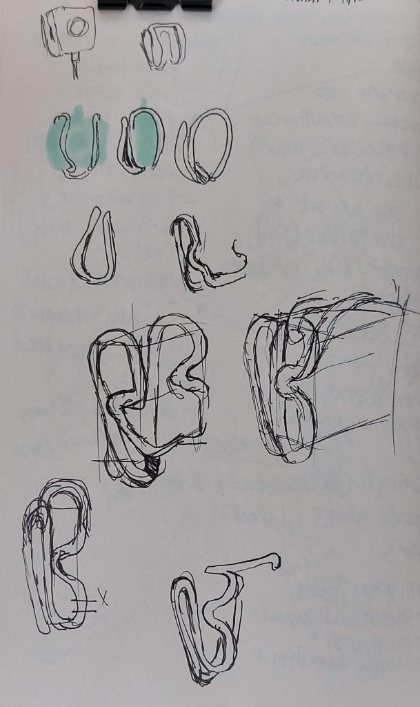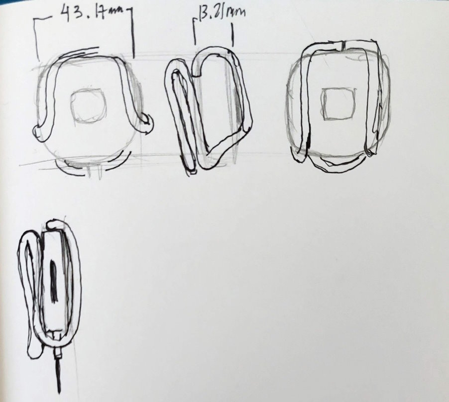 Sketched out a few ideas for the clip. After a few tries, I decided to bend the wire and figure it out along the way. Using the measurements from my caliper & with some pliers, I carefully folded the wire at the marked points.