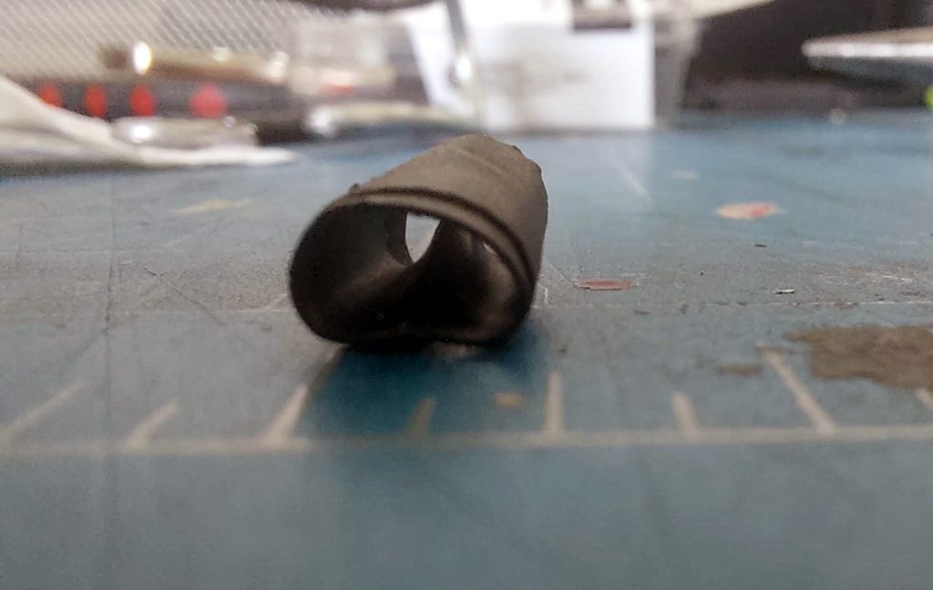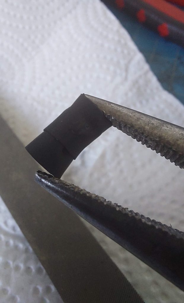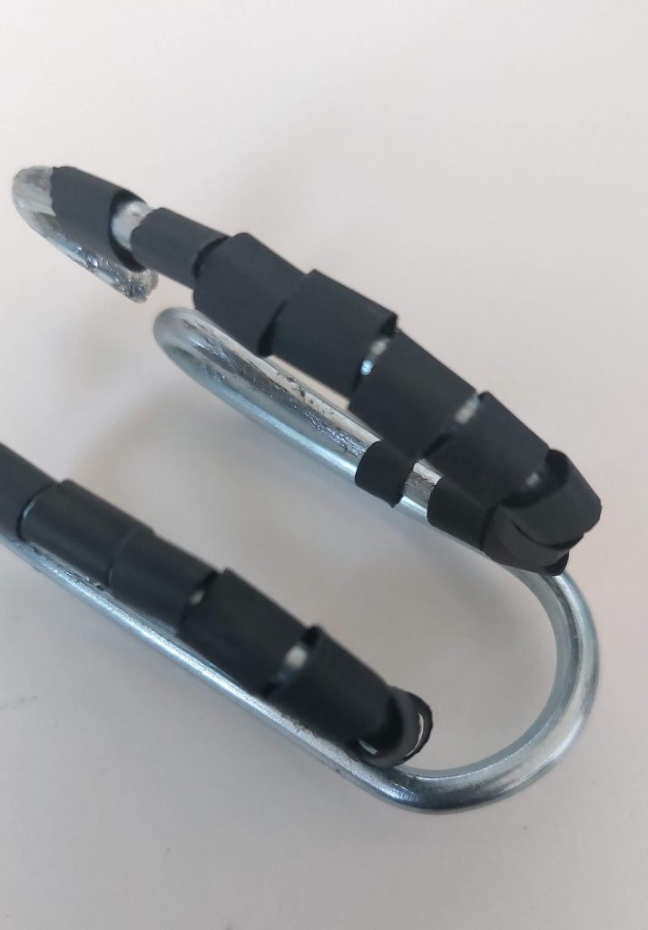 Once the clip was closer to completion, I noticed the receiver was getting a bit scraped up when fitting it in so protection would have to be included. After a quick trip to the hardware store, and a helpful idea from a clerk, I added heat shrink tubing to the filed down clip. Had to cut them down into smaller segments to easily slip them unto the winding wire. Another quick trip to the oven and the clip is done!