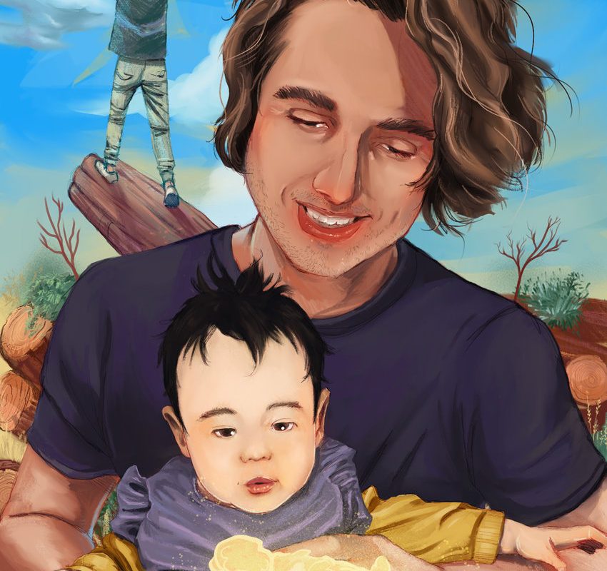 An avid outdoors-man and nature lover, what better way to portray their love with logs, the building block of lasting edifices. And, since their daughter’s name means “brilliant/lustrous,” adding a glowing warm lamb to symbolize the vastness of the pastoral background implies a growing potential for more love to come.